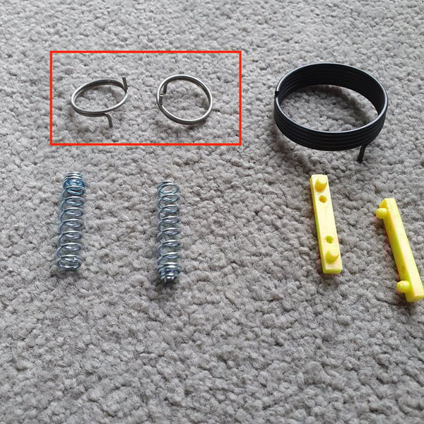 Lift the lever off and remove the broken spring, making sure any fragments of the spring are also removed from holes 1 and 2. You may need pliers or tweezers to remove the fragments.