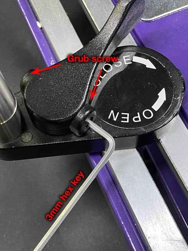 Using a 3mm hex wrench, undo the two grub screws on either side of the lever: