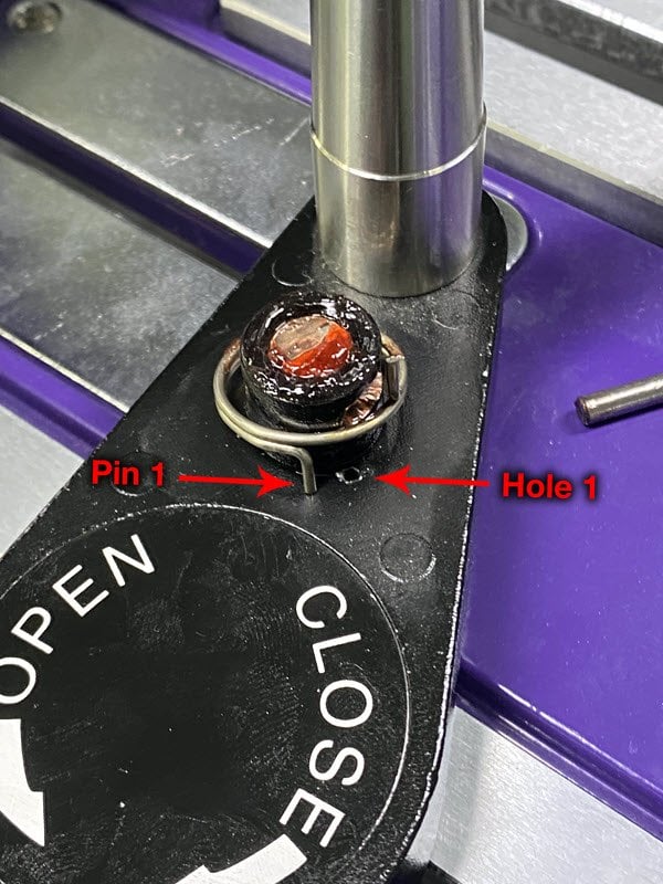 Place the new spring back into position, inserting the spring’s pin 1 into hole 1.