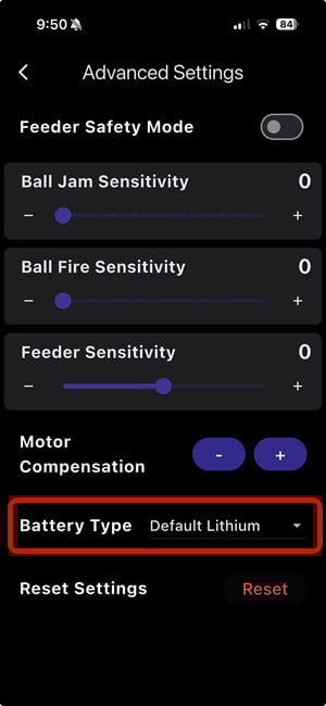 With the app connected to your machine, go to SETTINGS –> ADVANCED SETTINGS. You will receive a warning about adjusting these settings, press OK. Under BATTERY TYPE change it from SLA to DEFAULT LITHIUM.